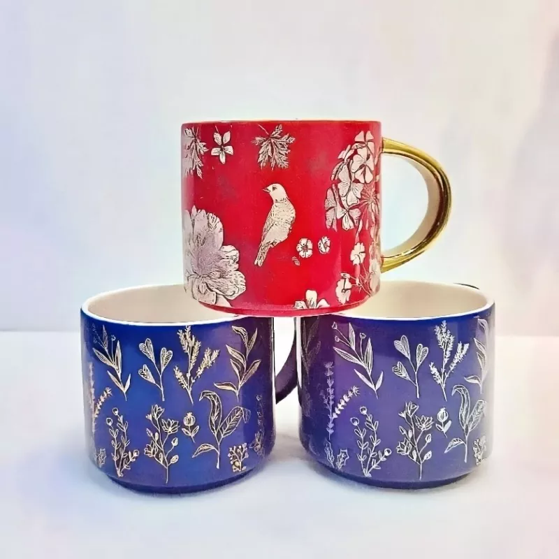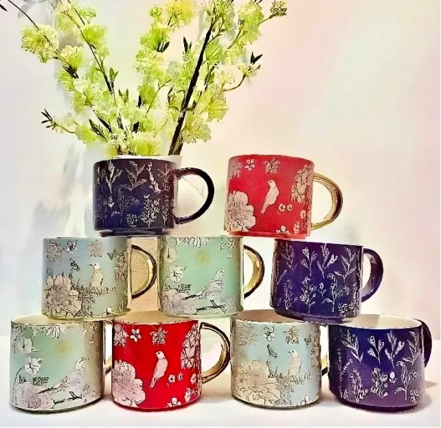 ఎలక్ట్రోప్లేటెడ్ గోల్డ్ హ్యాండిల్‌తో ఈ సిరామిక్ కప్పు, డెకాల్స్‌తో సూక్ష్మంగా రూపొందించబడింది, ప్రకృతి ప్రేరణతో ఒక ప్రత్యేకమైన మనోజ్ఞతను కలిగి ఉంటుంది. ఇది వికసించే పువ్వుల సున్నితమైన అల్లికలు, అతి చురుకైన పక్షుల యొక్క శక్తివంతమైన రూపాలు లేదా సహజ రంగు బ్లాకుల ఆకర్షణీయమైన నమూనాలు అయినా, కప్పు వృక్షజాలం, జంతుజాలం ​​మరియు శక్తివంతమైన రంగుల బహుమతులను సున్నితంగా సంగ్రహిస్తుంది. ప్రతి శైలికి అనుగుణంగా, కప్పు యొక్క హ్యాండిల్ అనుకూలీకరించదగినది. బంగారు పూతతో కూడిన వెర్షన్ 18 కే బంగారాన్ని పోలి ఉండే గొప్ప, బంగారు రంగుతో ప్రకాశిస్తుంది, ఇది అధునాతనత యొక్క స్పర్శను జోడిస్తుంది. ఇది మీకు ఇష్టమైన రంగుకు కూడా అనుకూలీకరించవచ్చు.