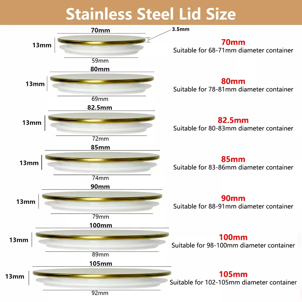 మా స్క్రీన్ ప్రింటింగ్ స్టెయిన్లెస్ స్టీల్ క్యాండిల్ జార్ మూతలు వివిధ పరిమాణాలలో లభిస్తాయి, అన్నీ మొత్తం 13 మిమీ ఎత్తుతో ఉంటాయి. నిర్దిష్ట కొలతలు మరియు అనుకూల కంటైనర్ ఓపెనింగ్‌లు క్రింద చూపించబడ్డాయి: